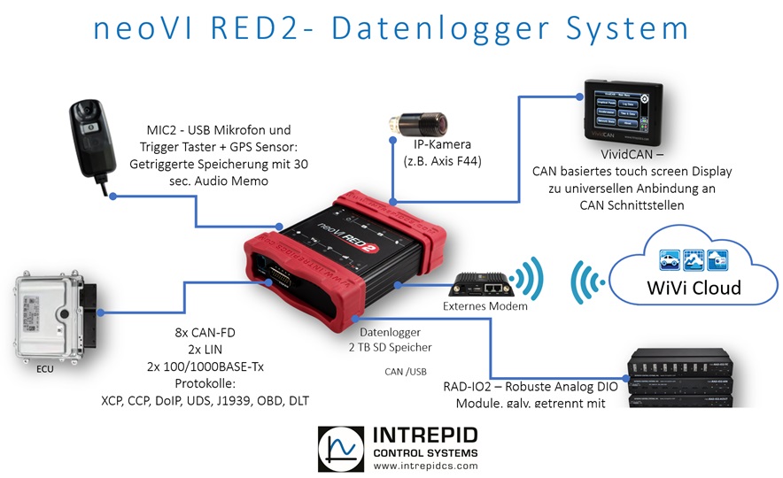 Bei Intrepid Control Systems wird der Datenlogger als ganzheitliches System gesehen, um die beschriebenen vielseitigen Applikationen abzubilden. Jeder Datenlogger ist an erster Stelle ein Netzwerk-Interface um Daten von CAN, LIN, FlexRay und Automotive Ethernet aus Steuergeräten über die bekannten Protokolle auszulesen und über die Vehicle Spy Software zu visualisieren. Logger spezifisch ist die Fähigkeit Daten bis zu 2 TB im Gerät zu speichern und über Funktionen wie Klemme 15 / Zündung und Wake-on-Bus Traffic und Datenspeicherung auszulösen. Der Datenlogger im Zentrum kann durch sehr praktische Systemkomponenten je nach Bedarf und Anwendung erweitert werden.